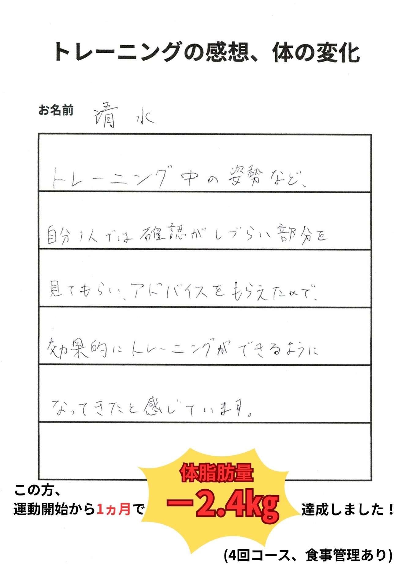 それぞれの事情に合わせ、自宅でもできるトレーニングもやっていきます。また、1人で24時間ジムに行けるようになるサポートもしています。